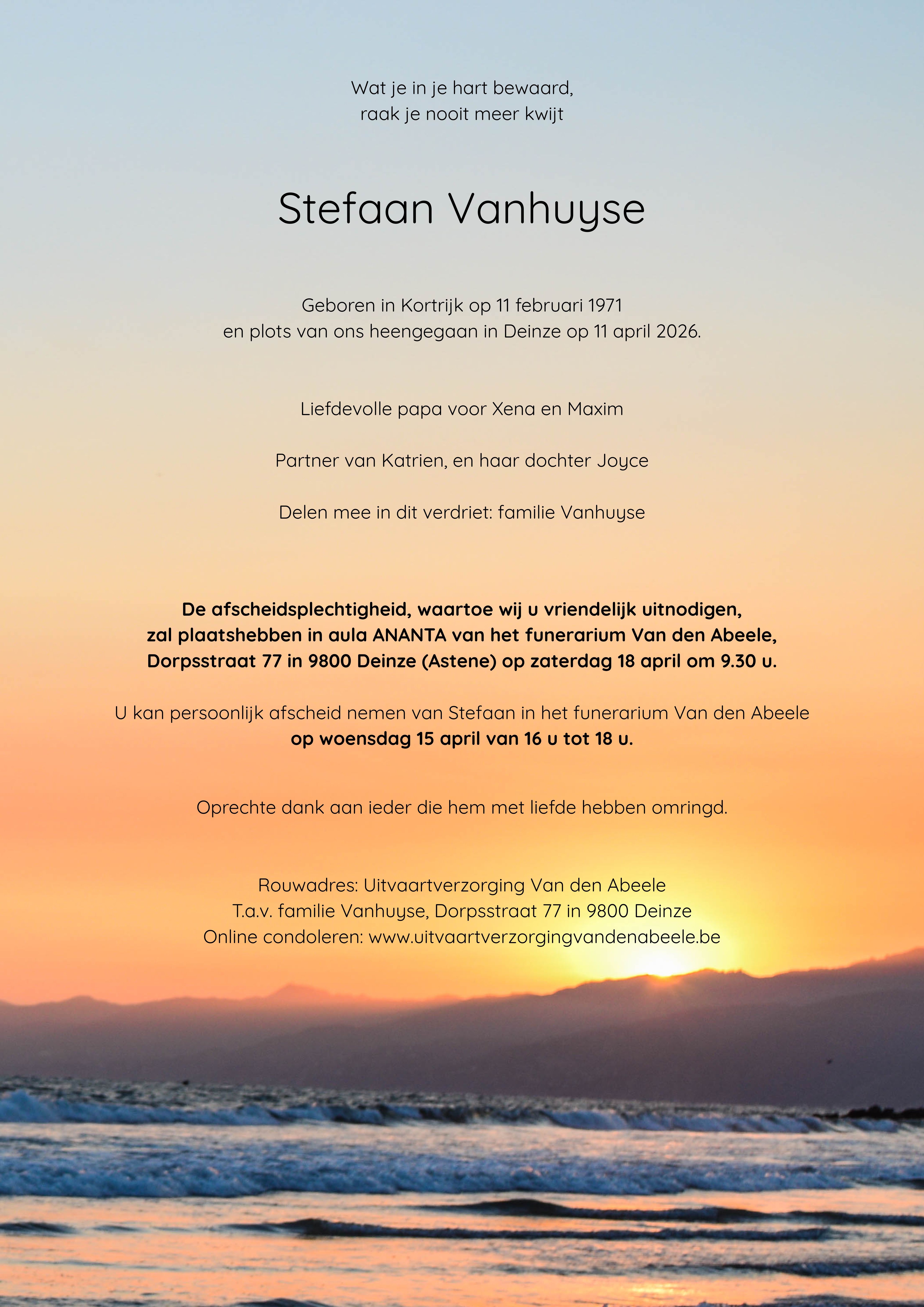 Begroeting in funerarium Astene op zaterdag van 14u tot 16u en maandag van 16u tot 18u.